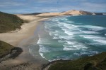 Our next stop was the end of the peninsula at the top of the north island, a little beachside town called Ahipara. Most places were booked so we stayed in an old retro campervan that was cheap but lacked heat so we barely slept. Because of the cold, it was hard to camp in general, so this was as close as we came. Next we drove up to Cape Reinga, at the very very tip of the peninsula, and it was out of this world. A little lighthouse sits on the coast on top of a cliff and there are untouched beaches all surrounding it. Since a few were accessible via hiking trails we decided to explore and trekked down to a massive beach lined with lava rocks, green mountains, steep cliffs, enormous sand dunes and glistening clear water with gigantic rolling waves. We were the only people on this beach, and the setting was so powerful and surreal. Places like this don’t exist anymore! We then went to see the giant sand dunes (official name) where people take boogie boards and fly down at incredible speeds. We climbed up one of those steep monsters (SO exhausting… crawling up vertically through sand is nearly impossible) and ran/rolled back down.